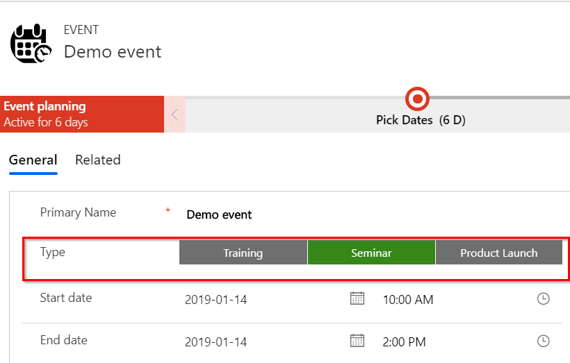 So I’m continuing with my custom entity called Event. I have added an event type to my entity so my event is either a seminar, a training or a product launch.