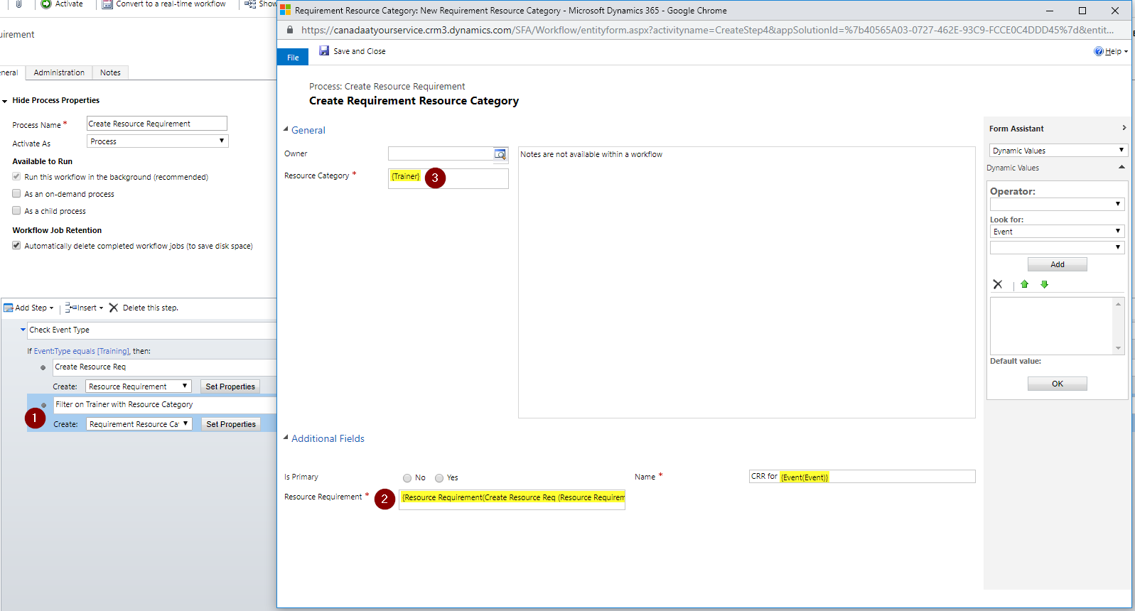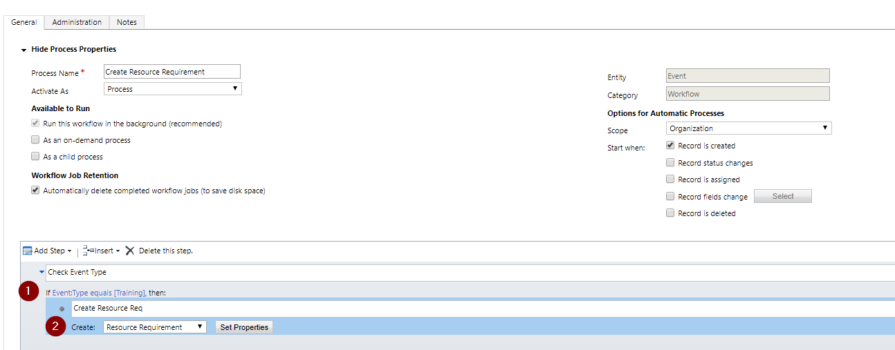 First of all I want to check that the Event Type is Training (1) and if so create a Resource Requirement (2).