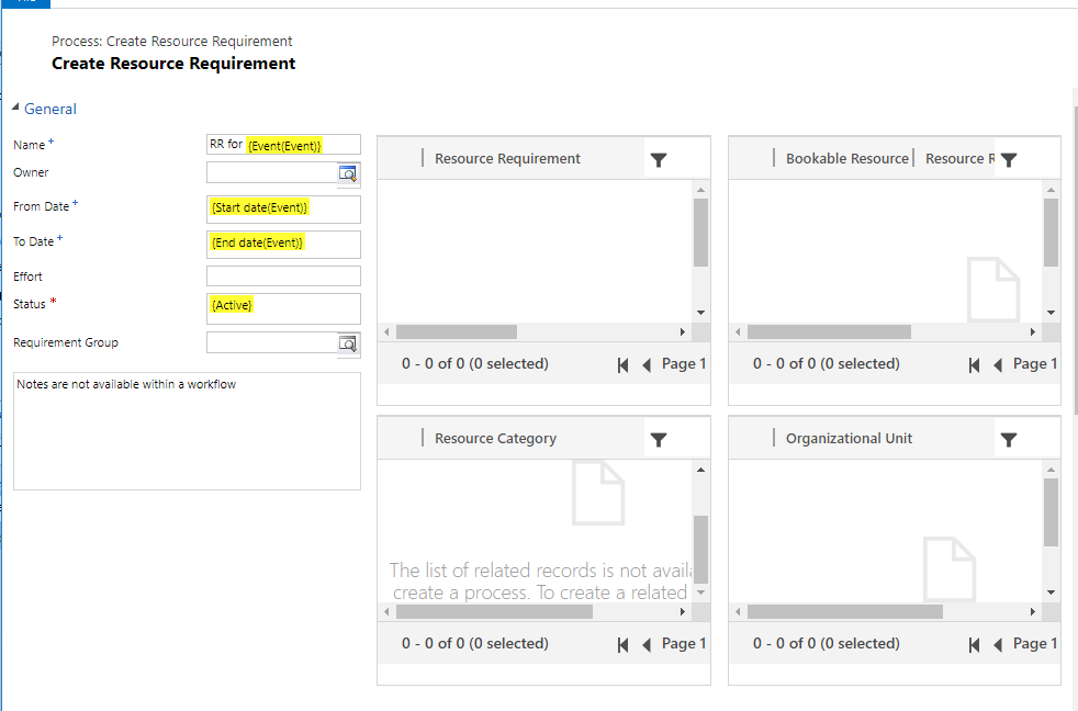 I’ll keep it simple and populate the Resource Requirement with the following fields from Event: