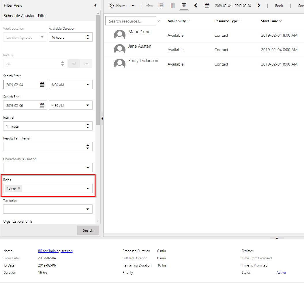 I will therefor make sure all my Trainers have a Bookable Resource Category assn that relates to a Bookable Resource Category named “Trainer”.